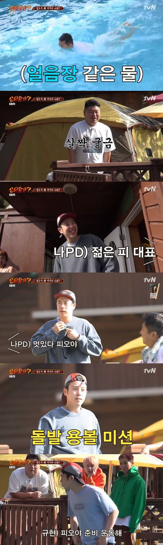 피오는 멀찍이 서서 이 모습을 지켜보고 있었다. 이에 나영석PD는 "피오는 하지마라. 이거 다 옛날꺼다"라고 말해 웃음을 자아냈다. 그때 갑자기 피오가 옷을 벗기 시작했다. 나영석PD는 "들어가서 피오가 한 마디도 안하면 용볼을 주겠다"라고 말했다.