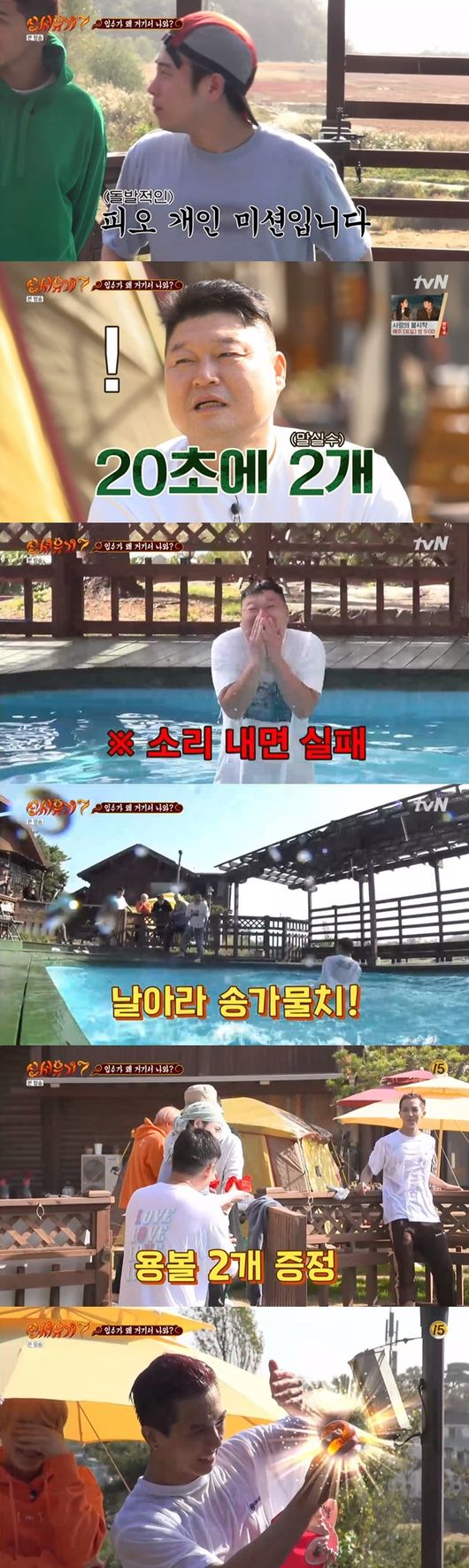 그때 강호동이 1분을 제안했다. 나영석PD는 "1분도 아니고 20초에 두 개 하자"라고 말했다. 이에 강호동은 거침없이 물에 들어갔다. 강호동은 20초를 버텨냈다. 그때 이어서 송민호까지 입수를 자처했다. 송민호는 "용볼 안 주셔도 된다"라고 시원하게 말했다.