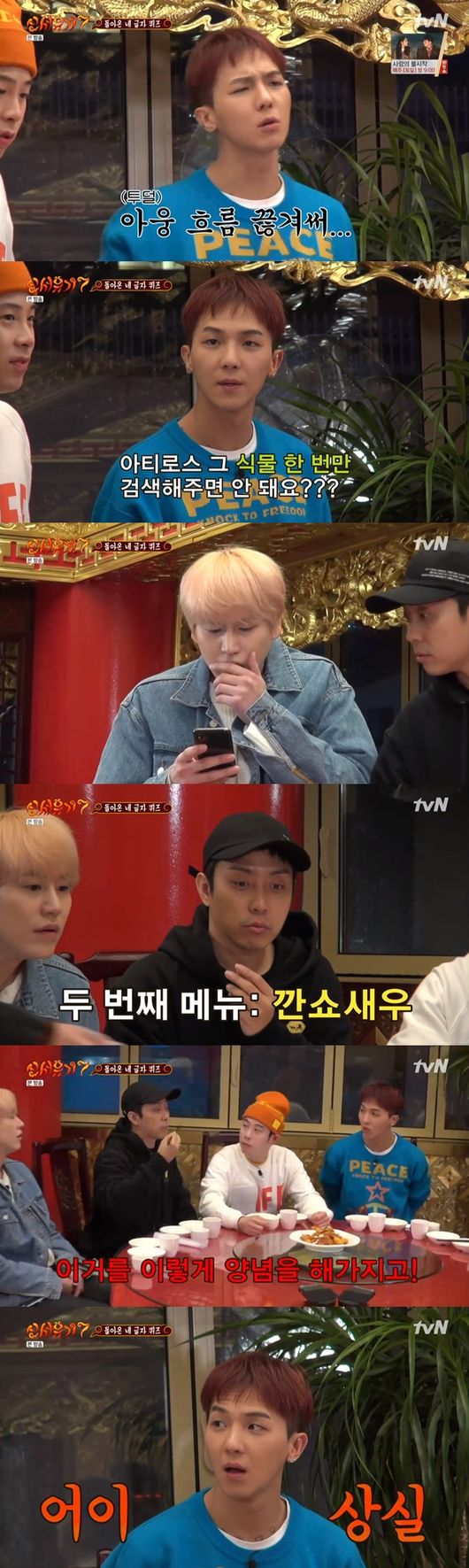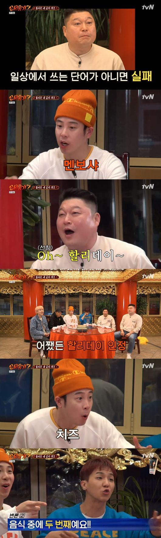 멤버들은 음식을 걸고 네 글자 퀴즈를 시작했다. 제작진이 두 글자를 말하면 나머지 두 글자를 완성하는 퀴즈. 첫 번째 음식은 멘보샤였다.