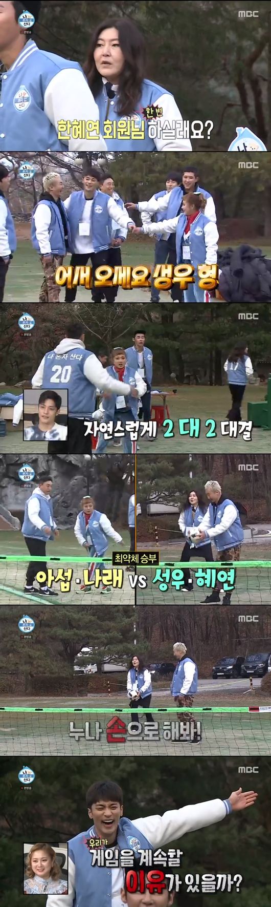 결국 멤버들은 한혜연에게 손을 허용했다. 한혜연이 손으로 넘겨 서브를 하자 박나래는 이 공을 받기 위해 뛰어왔지만 다리가 짧아 공에 닿지 못해 주위를 웃음바다로 만들었다. 이어서 박나래가 서브를 넘겼다. 하지만 이성우는 헛발질을 했고 한혜연은 신발을 날려 주위를 폭소케 했다.