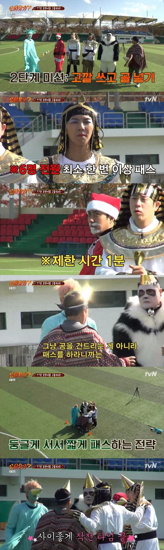 미션은 고깔축구였다. 고깔을 앞으로 쓰고 서로 패스를 해 골을 넣으면 성공인 미션. 멤버들은 고깔을 쓰기 전에 작전을 짜기 시작했다. 마지막 슈팅은 이수근이 하기로 했다.