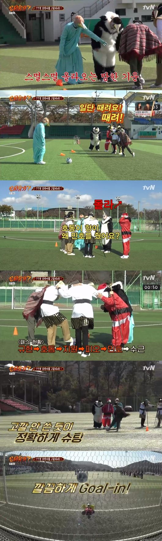 하지만 첫 번째 시도는 실패했다. 두 번째 시도는 순조로웠다. 멤버들은 예정된 순서대로 공을 패스했다. 마지막으로 이수근만 공을 차면 성공인 상황. 하지만 송민호가 준 공이 이수근의 발을 빗겨 나갔다. 이에 이수근은 당황했지만 공을 봤다.