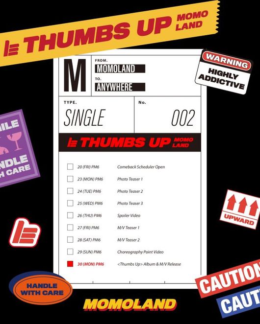 모모랜드는 지난 20일 오후 6시에 공식 SNS 채널을 통해 새 싱글앨범 '떰즈업(Thumbs Up)'의 프로모션 일정이 담긴 스케줄러 이미지를 공개했다.