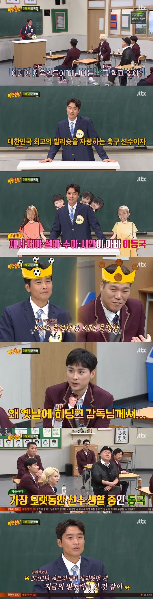 이날 이동국이 축구공을 들고 등장했다. 이동국은 "대한민국 최고의 발리슛을 자랑하는 축구 선수이자 사랑하는 아내와 다둥이까지 모든 걸 다 가졌고에서 전학온 이동국이다"라고 자신을 소개했다.