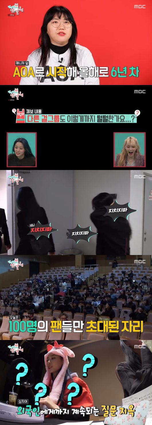 이날 AOA매니저 김혜림이 등장했다. 매니저는 "멤버들이 상당히 털털하다. 다들 걸그룹도 이렇게까지 털털한지 너무 궁금하다"며 제보를 한 이유를 밝혔다. 이어 AOA 멤버들이 무대를 마치고 나오면서 쉴 새 없이 이야기를 했다. 이 모습에 전현무는 "한명도 쉬지 않고 말을 해. 대단하다"고 말했다.