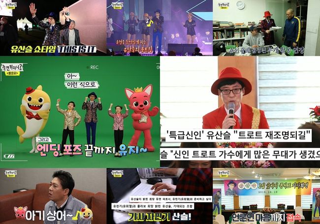 지난 21일 방송된 MBC ‘놀면 뭐하니?-뽕포유’(연출 김태호)에서 유산슬은 ‘가요베스트’ 무대로 1만 관중의 뜨거운 떼창을 유발하는가 하면 ‘핑크퐁’과 ‘아기상어’ 특급 컬래버로 글로벌 동요까지 접수해 무한 확장된 행보를 걸었다. 여기에 ‘1집 굿바이 콘서트’ 기념 깜짝 기자간담회를 통해 진정성 있는 이야기를 전하며 대한민국을 강타한 ‘유산슬 매직’에 더욱 불을 지폈다.