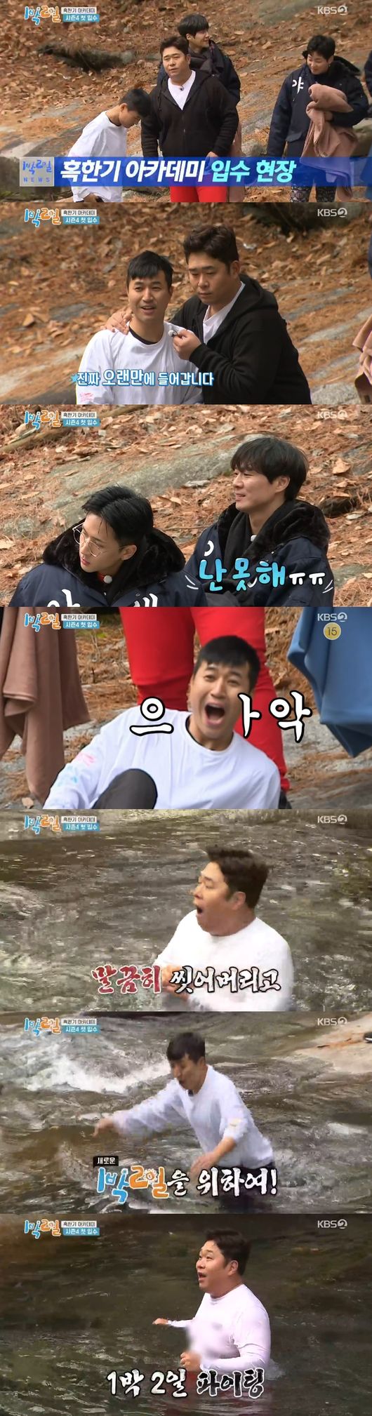 다 함께 차를 타고 혹한기 훈련장으로 이동했다. 완벽한 입수조건이 가득한 계곡이 있는 곳이었다. 선녀들도 내려와 목욕을 했다니 인제의 숨은 명소 오개탕 계곡이었다. 극한의 훈련인 입수 복불복이 돌아온 것이다. 제작진은 "야생력 상승의 메카, 야생 훈련의 정수"라며 입수훈련이 1박2일의 자존심이라 강조했다.