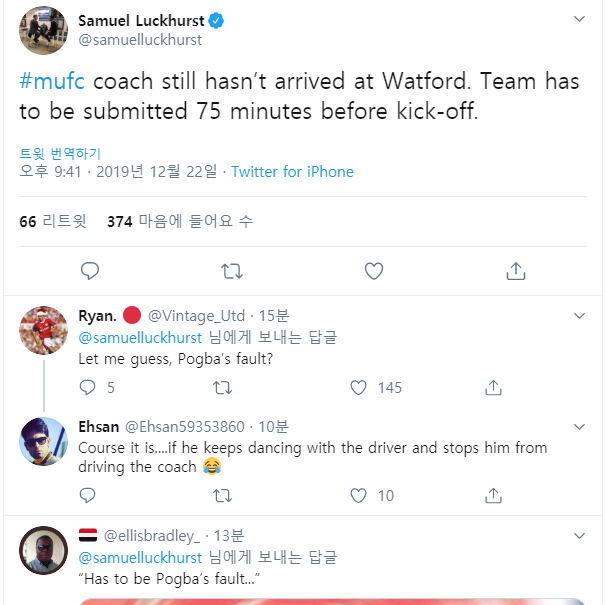 프로로 기본적인 일정도 지키지 못하는 맨유를 향해 팬들의 조롱이 이어졌다. 여러 축구 팬들은 "포그바 잘못이지?"라거나 "포그바가 기사랑 춤춘다고 솔샤르 감독이 운전하는 것을 막는 듯"이라고 비웃었다.