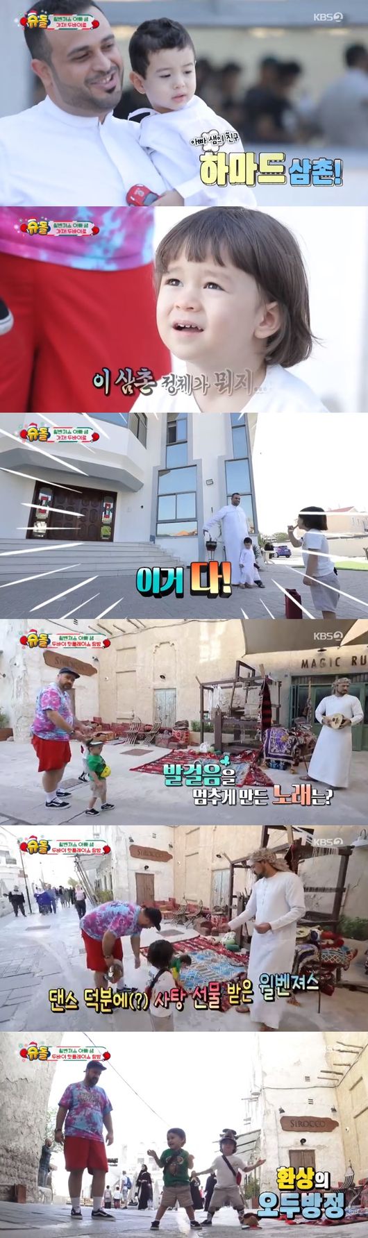 이후 세 사람은 두바이 과거와 현재가 공존하는 한국의 인사동, 알 시프로 나섰다. 그곳에서 전통악기를 연주하는 사람과 마주했고 윌리엄은 연주에 맞춰 몸을 흔들었다. 이에 연주자가 선물로 사탕을 줬고 벤틀리는 맛있다고 행복해했다.