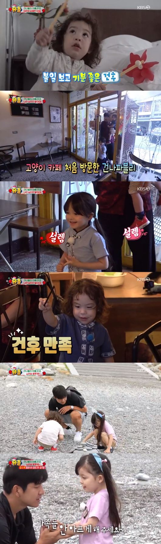 세사람은 나은이가 건넨 준 칫솔로 양치질을 마치고 '고양이 카페'로 향했다. 건나블리는 고양이를 만지기 전 손 소독을 했고 박주호는 고양이에게 해서는 안 되는 것들을 건나블리에게 차분하게 설명했다. 건후는 흰 고양이에 시선을 빼앗긴 채 고양이를 만지며 애정을 드러냈다.