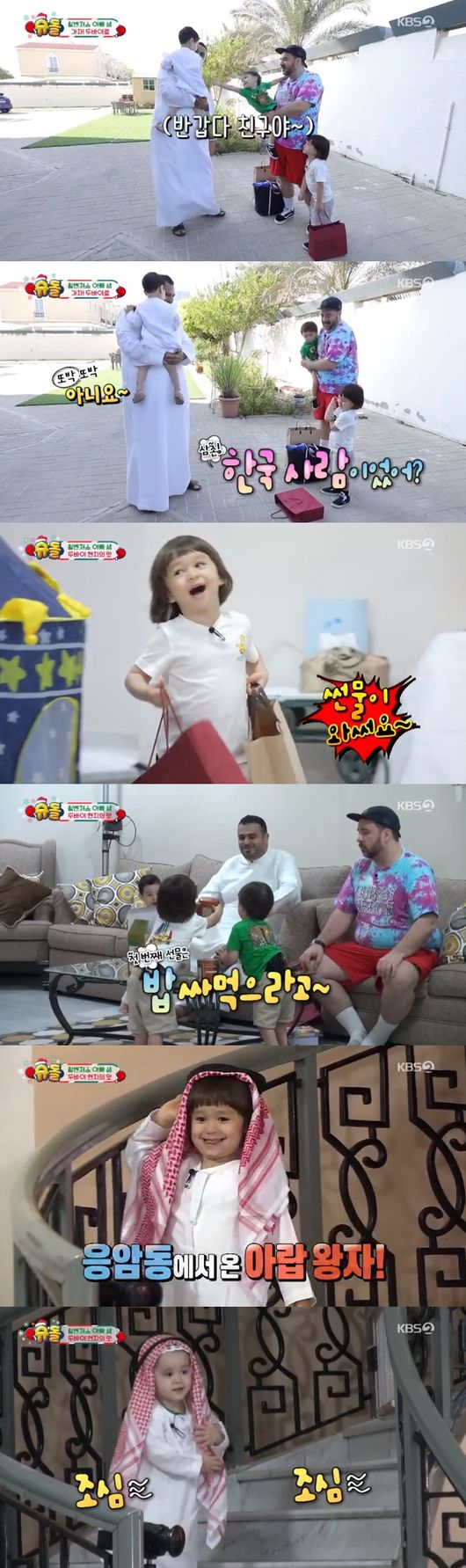 이어 윌리엄은 사이드가 입은 옷이 예쁘다고 말했고 하마드는 선물이라며 두바이 전통의상 '칸두라'를 건넸다. 이에 윌리엄은 "뭘 이런 걸 다"라고 대답한 후 곧장 칸두라를 입고 나타났다. 아이들은 칸두라를 입고 거실에서 놀았고 아빠들은 부엌에서 옛 과거를 회상했다.