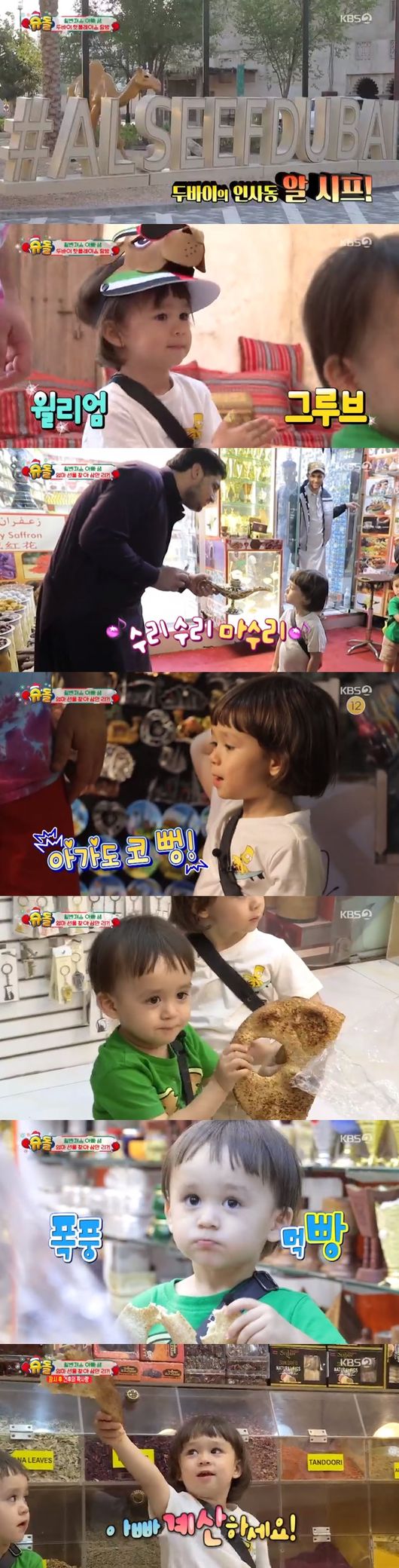 이후 두바이 과거와 현재가 공존하는 두바이의 인사동, 알 시프로 나섰다. 그곳에서 전통악기를 연주하는 사람과 마주했고 윌리엄은 연주에 맞춰 몸을 흔들었다. 이에 연주자가 선물로 사탕을 줬고 벤틀리는 맛있다고 행복해했다.