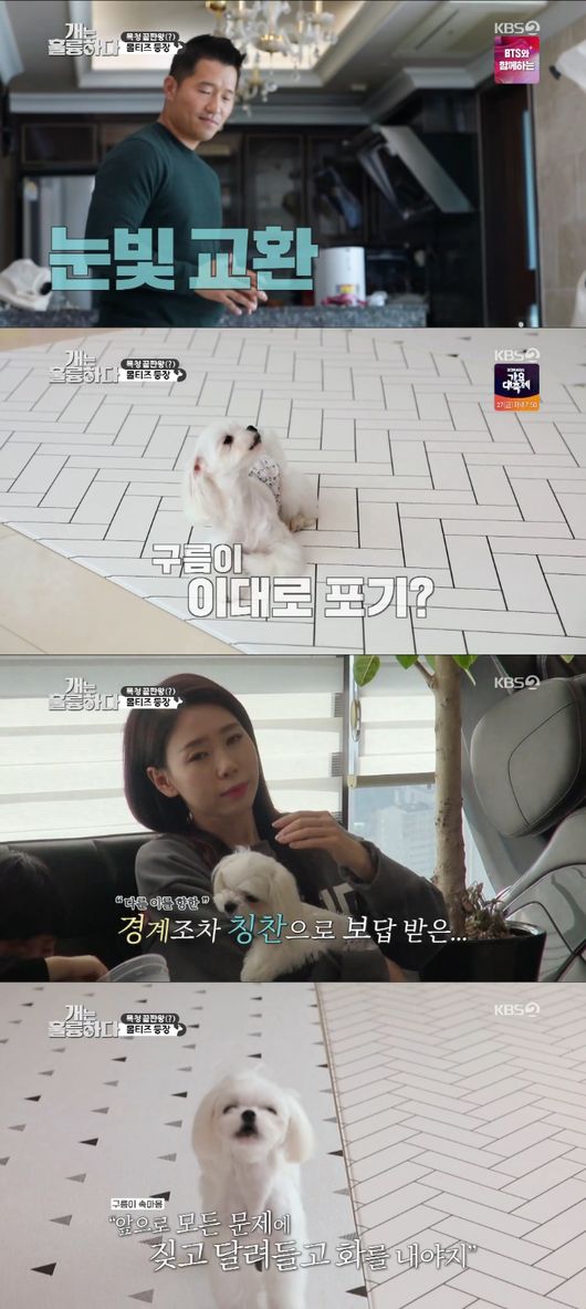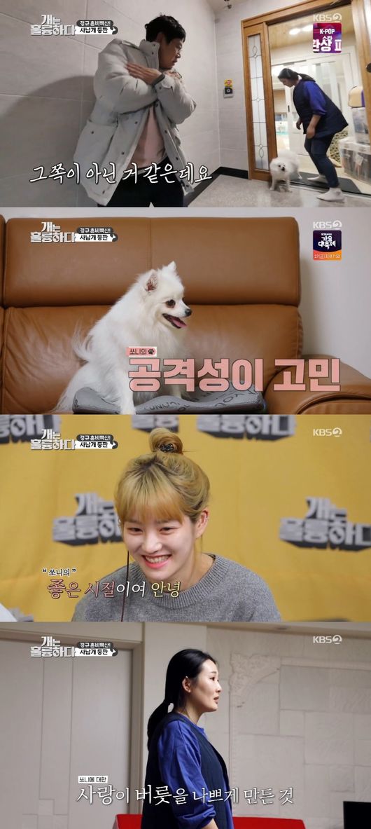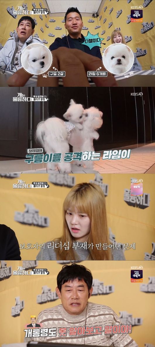 23일 오후 방송된 KBS2 예능 프로그램 ‘개는 훌륭하다’에서는 공격성이 심한 반려견을 제지하는 등 반려견의 사회성을 재정의하고 훈련을 이어가는 강형욱과 이경규, 이유비의 모습이 그려졌다.