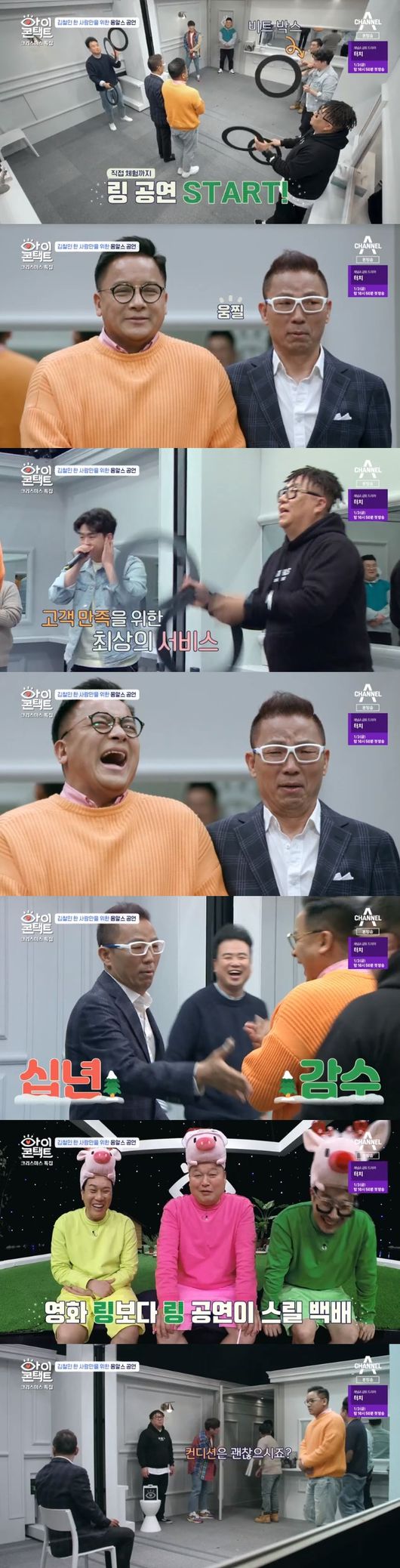 후배 최기섭의 성대모사 개인이가 이어지는 가운데 스튜디오에서 호동과 하하도 "너무 똑같다"면서 웃었다. 이어 저글링이 시작된 가운데, 철민이 아이처럼 웃기 시작했다. 호동도 이를 보면서 "정말 대단하다"고 박수를 쳤다. 이어 링을 이용한 무대가 이어졌다. 무서워하는 철민을 위해 수원이 "선배님 저랑 손 잡고 서 있을까요"라고 했다. 수원과 철민이 손을 잡고 서 있는 가운데 그들 사이로 링이 오고 갔다.