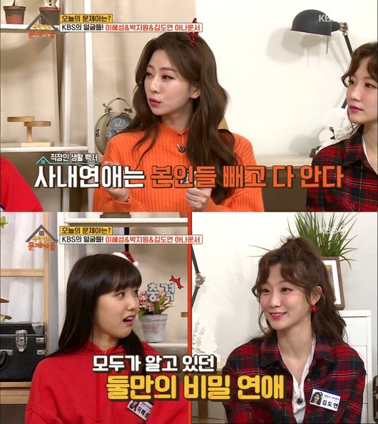 23일 방송된 KBS2 예능 프로그램 ‘옥탑방의 문제아들’은 크리스마스 특집으로 꾸며졌다. 이날 방송에는 KBS 간판 아나운서 이혜성, 박지원, 김도연이 출연해 김용만, 송은이, 정형돈, 민경훈과 퀴즈를 풀었다. 김숙은 김진 PD를 대신해 실로폰을 잡으며 문제를 출제했다.