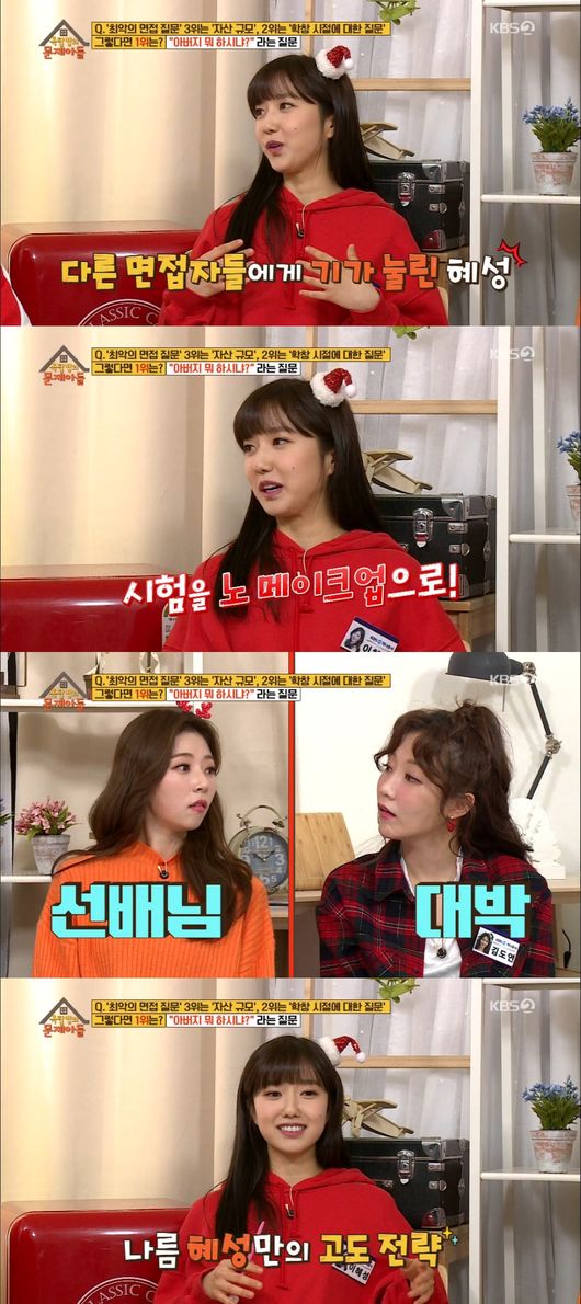 이혜성 아나운서는 솔직하고 털털했다. 고3 수험표를 공개하기도 했고, 아나운서 시험 때 민낯으로 임해 합격했다는 일화도 소개했다. 전현무와 열애 에피소드에 대해서도 솔직하게 이야기하며 부러움을 샀다.