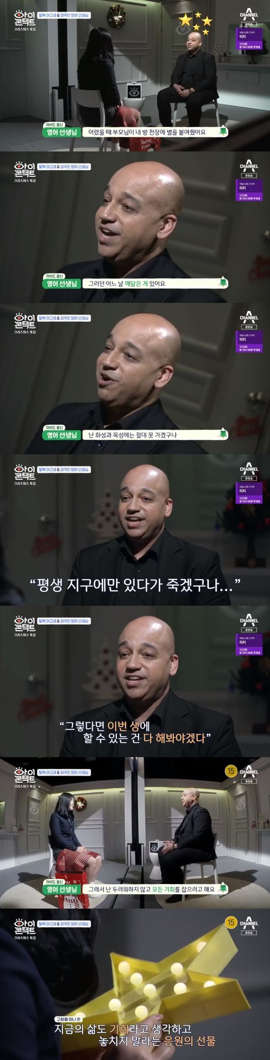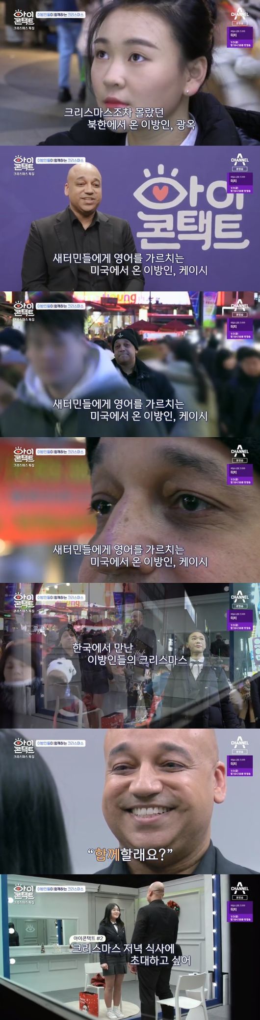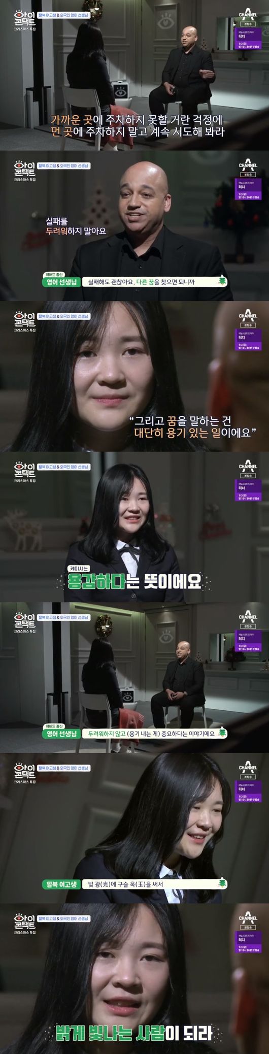 23일 오후 방송된 채널A '아이콘택트' 크리스마스 특집으로 새터민 여고생과 하버드 출신의 외국인 교사가 출연해 아이콘택트를 진행 했다.