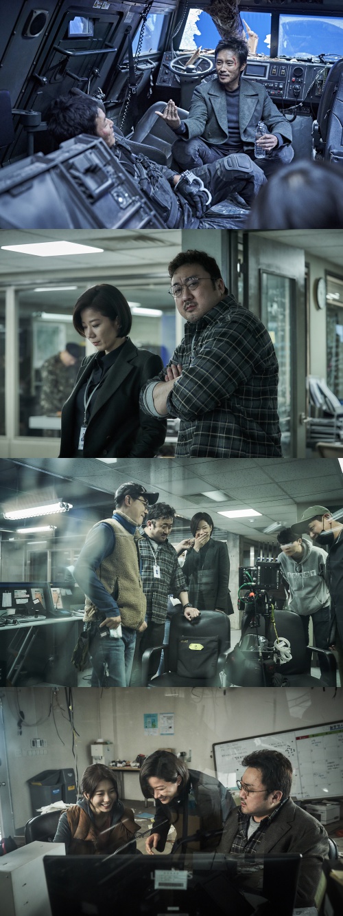 뿐만 아니라 지질학 교수 강봉래 역 마동석, 작전을 계획하는 전유경 역 전혜진, 반드시 살아남아야 하는 최지영 역 배수지의 스틸은 영화 속에서 또 다른 재미를 완성한 이들의 찰떡 호흡을 담아내 보는 이에게 기분 좋은 미소를 자아낸다.