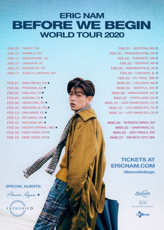 특히 에릭남이 아시아 지역에서 투어를 개최하는 것은 이번이 처음인 만큼 최근 발매한 데뷔 첫 영어앨범 'Before We Begin' 수록곡을 비롯해 대표곡들로 무대를 꾸미며 2020년의 시작을 뜨겁게 달굴 전망이다.