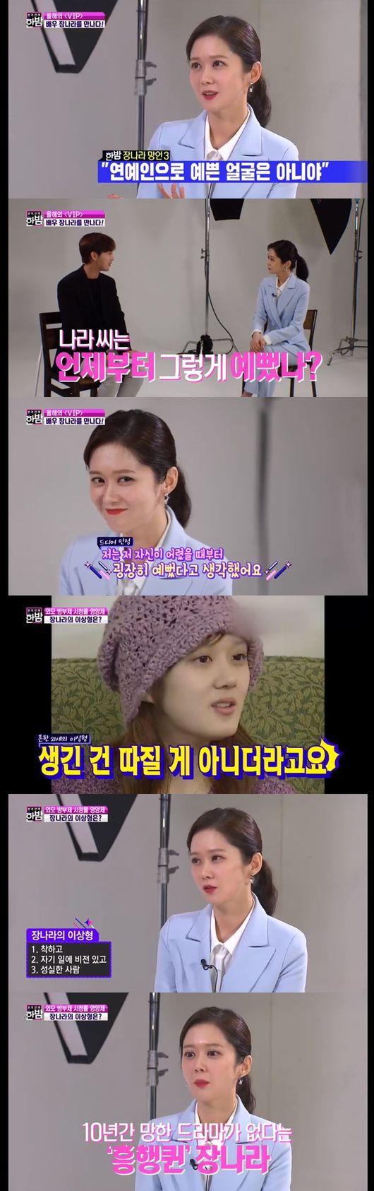 이날 장나라의 과거 인터뷰가 공개돼 눈길을 끌었다. 과거 21살의 장나라는 이상형에 대해 "나만 좋아하는 사람이 좋다. 생긴 건 별로 중요하지 않다"라고 말했다. 이 모습을 본 장나라는 "쟤 왜 저러냐"라고 시원하게 웃었다. 장나라는 최근 자신의 이상형에 대해 "착하고 자기 일에 비전이 있고 성실한 사람이었으면 좋겠다"라고 설명했다.