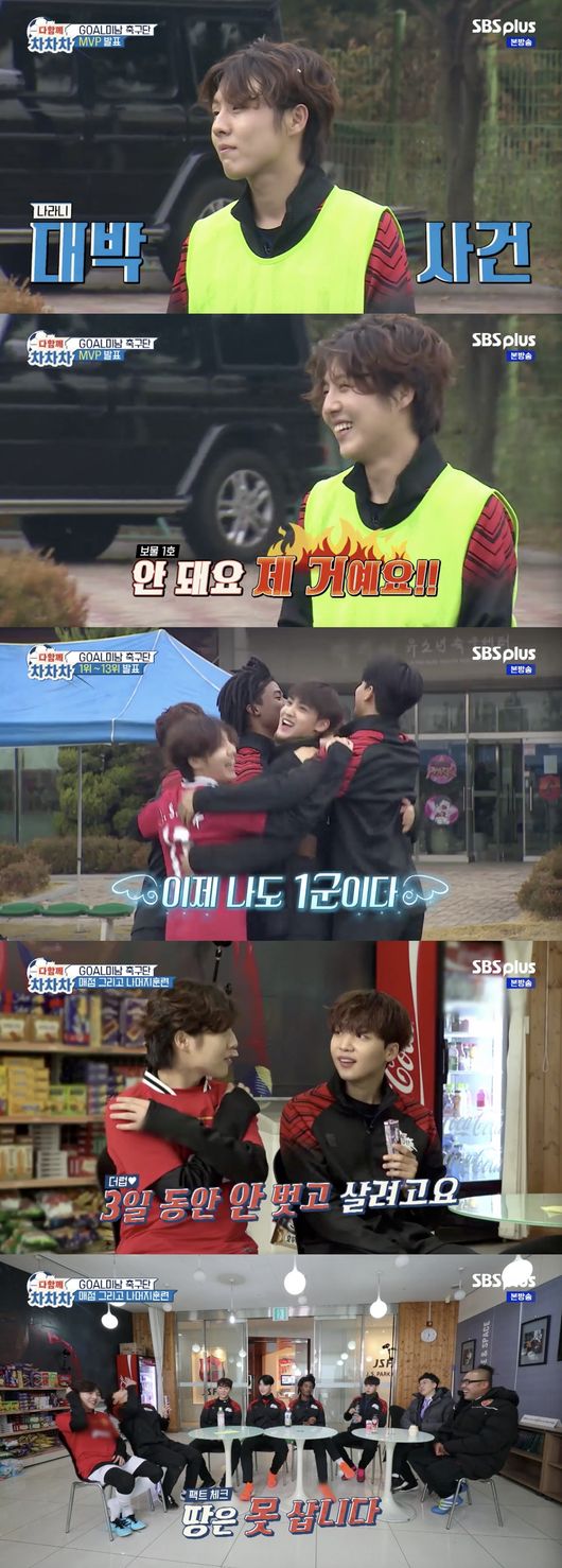 다함께 팀과 차차차 팀으로 나뉜 멤버들은 비가 오는 궂은 날씨 속에서도 열심히 경기에 임했다. 이날 경기 MVP에게는 박지성이 직접 입었던 경기 유니폼이 걸려있었기 때문.