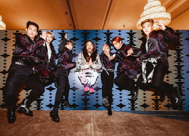 공개된 사진 속 몬스타엑스는 한복 디자인의 무대 의상을 입고 눈부신 비주얼을 자랑, 스티브 아오키는 화려한 네온 컬러의 패션으로 시선을 끈다. 두 팀은 카메라를 향해 브이 포즈와 환한 미소를 보여줘 훈훈함을 더한다.