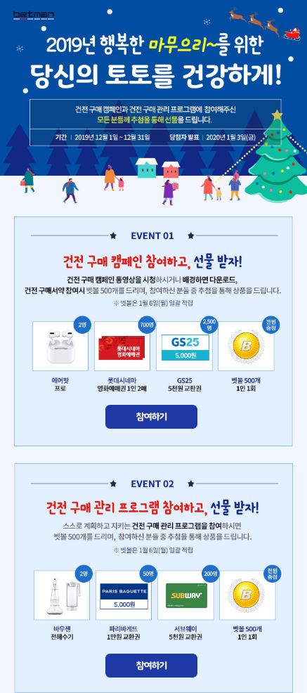국민체육진흥공단이 발행하는 체육진흥투표권 스포츠토토의 공식온라인 발매사이트인 베트맨(www.betman.co.kr)의 12월 건전화 프로그램 이벤트인 ‘당신의 토토를 건강하게!’가 조회수 4만건(24일 오후 5시 현재)을 돌파하는 등 뜨거운 인기를 얻고 있다.