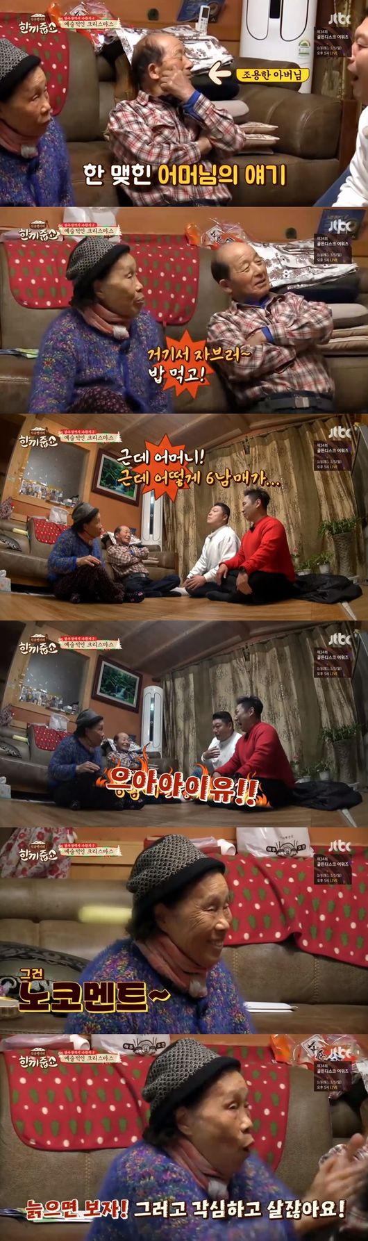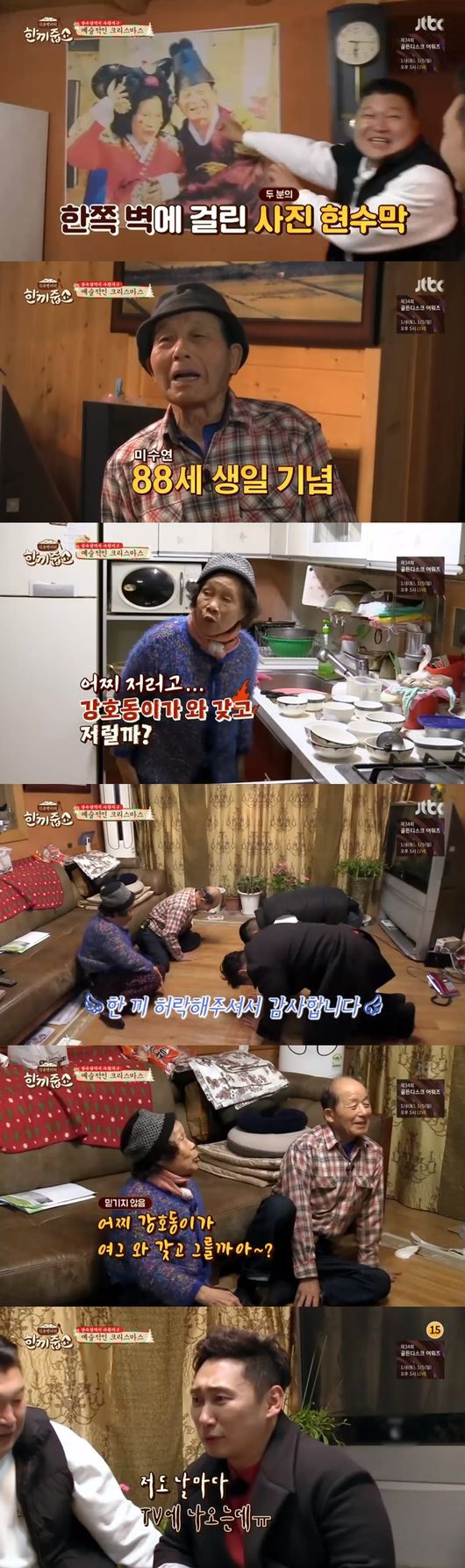 이날 할머니는 맛깔나는 반찬을 꺼내 따뜻한 식사를 준비했다. 강호동은 할머니와 할아버지에게 "오늘 저희가 오지 않은 것처럼 식사를 먼저 해달라"라고 말했다. 이에 할머니와 할아버지는 눈도 마주치지 않고 이야기를 나눴다.