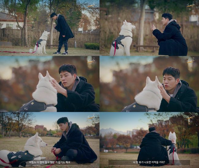 한적한 공원에 ‘진’을 데리고 나타난 홍종현은 “얘는 ‘진’이다. 많은 분들이 보자마자 ‘무슨 종이냐?’라고 물어보시는데 허스키와 진돗개의 믹스견이다. 지금 5년째 키우고 있다”며 반려견을 소개했다. ‘진’에게 끌려다니다시피 공원을 뛰어다니던 홍종현은 공원 한켠에 자리를 잡고는 개인기를 보여주겠다면서 간식을 손에 들었다. 엎드려, 턴 등을 시키던 것도 잠시, ‘진’이 먹는 모습만 봐도 뿌듯하다는 듯 꿀 떨어지는 눈빛을 보여줬다.