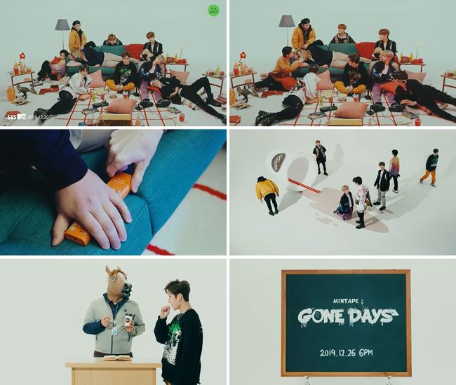 이에 앞선 26일 0시 공식 SNS 채널에 신곡 뮤직비디오 티저 영상을 게재했다. 지루한 듯 지친 모습으로 둘러앉은 여덟 멤버는 말 가면을 쓰고 잠든 사람의 손에서 리모컨을 슬그머니 빼앗는다. 리모컨 쟁탈에 성공할 찰나, 정체불명의 인물이 갑자기 깨어나면서 짜릿한 긴장감을 불어 넣는다.