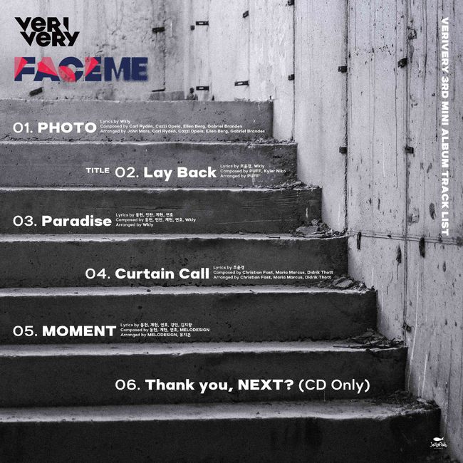 이어 공개된 트랙리스트에서는 세 번째 미니앨범의 타이틀곡 ‘Lay Back’을 비롯해 총 여섯 곡에 대한 정보가 담겨있다. 첫 번째 트랙인 ‘PHOTO’부터 ‘Paradise’ , ‘Curtain Call’ , ‘MOMENT’ , CD에만 수록되는 ‘Thank you, NEXT’까지 전체 수록곡을 처음으로 알리며 다양한 곡들로 호기심을 자극했다.