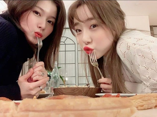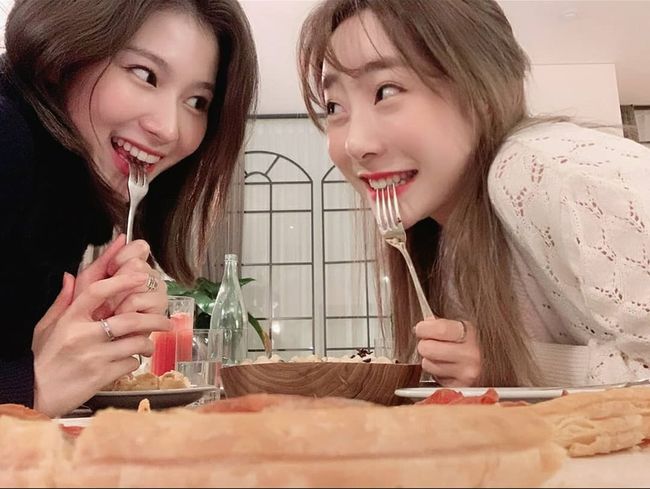 유연정과 사나 모두 우열을 가릴 수 없는 미모를 자랑 중이다. 포크를 입에 가져가면서 입술을 내미는 애교를 보여주는가 하면, 함께 아이콘택트를 하며 웃고 있는 모습이 인상적이다.
