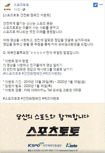 이번 이벤트의 경우, 스포츠토토 공식 페이스북에 방문해 건전한 스포츠토토 문화를 장려하기 위해 준비된 캠페인 영상을 시청한 후 친구들에게 해당 영상을 전달하고, 주어진 퀴즈에 알맞은 정답과 해시태그를 답글로 남기면 참여가 완료된다. 퀴즈의 경우, ‘체육진흥투표권 ‘ㅇㅇㅇㅇㅇ’만이 유일한 합법입니다’ 의 빈칸을 채우는 문제가 주어졌다.