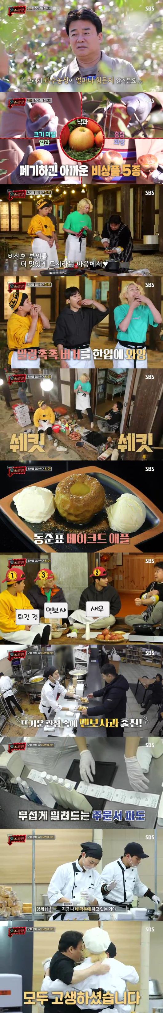 이어 멤버들의 ‘사과 활용 요리 개발’ 숙제 결과가 공개됐다. 양세형은 아이들 간식으로 제격인 ‘사과 도넛’을, 김동준은 사과 속을 버터로 채워 시나몬 가루, 아이스크림 등과 곁들여 먹는 ‘허니 버터 시나몬 애플’을 준비했다. 첫 번째 장사에서 ‘요알못’으로 등극한 김희철은 전문가에게 직접 전수까지 받으며 야심 차게 준비한 ‘논 알코올 사과 칵테일’을 선보였다. 그러나 신나게 칵테일 셰이커를 흔들던 김희철은 실수로 백종원에게 사과 칵테일을 쏟아버려 웃음을 자아냈다.