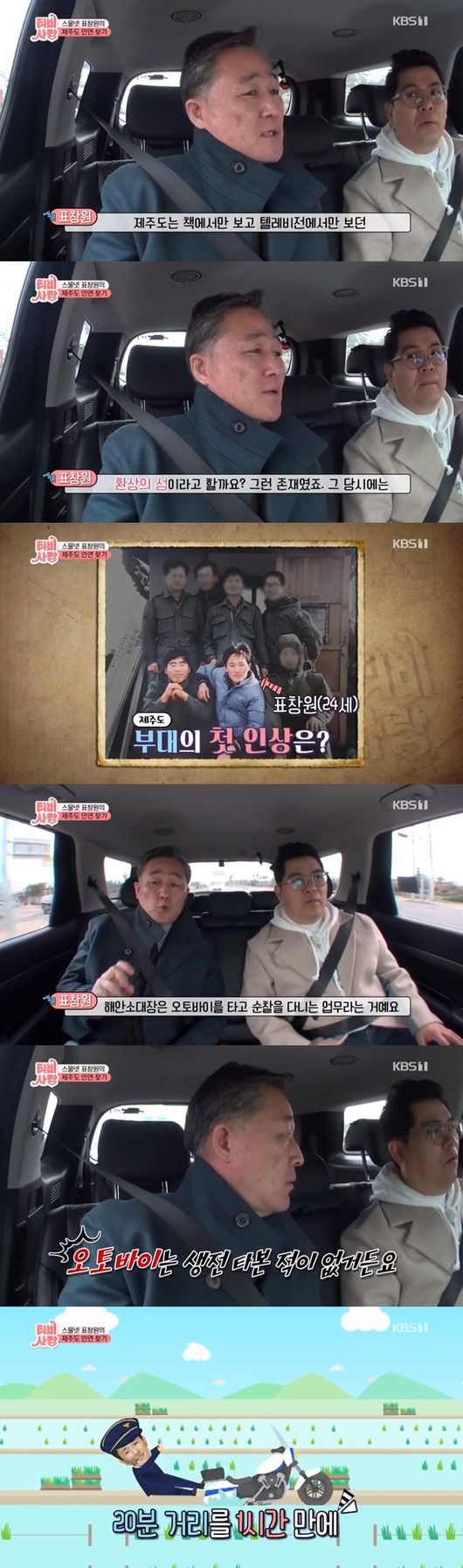 표창원은 "처음 제주도에 왔을 때 해안 소대장은 오토바이를 타야 한다고 하더라. 그때 오토바이를 한 번도 타본 적이 없었다. 어쩔 수 없이 타고 가다가 넘어졌다. 20분 거리를 1시간 걸려서 갔다"라고 말해 웃음을 자아냈다.