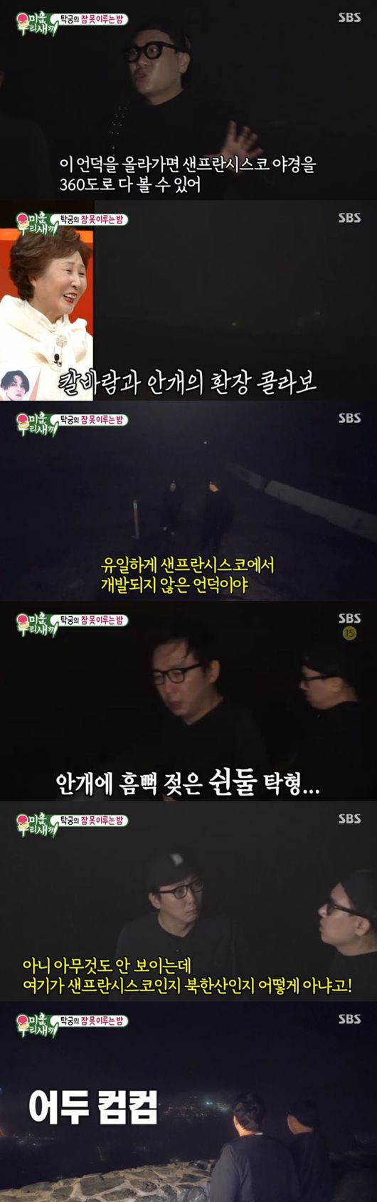 이상민과 탁재훈의 미국여행기가 그려졌다. 두 사람은 낭만있는 야경을 즐기며 드라이브에 나섰다. 이상민은 1년 동안 샌프란시스코에 있었다고 했고, 자신이 유학시절 답답했을 때마다 찾았던 곳이라며 어디론가 향했다.
