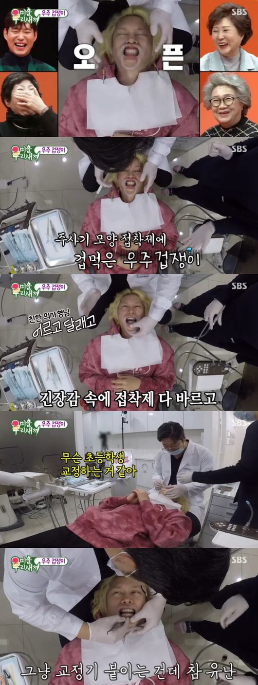 주사기 모양접착제까지 김희철은 겁에 질려하면서 긴장, 의사는 마치 아이를 달래듯 치료를 진행했다. 의사는 "무슨 초등학생 대하는 것 같다"고 말했고 차렷자세로 겁에 질린 김희철 모습이 폭소를 일으켰다. 김희철은 아프다고 하면서도 수다를 끊이지 않았고 우여곡절 끝에 교정을 마쳤다.