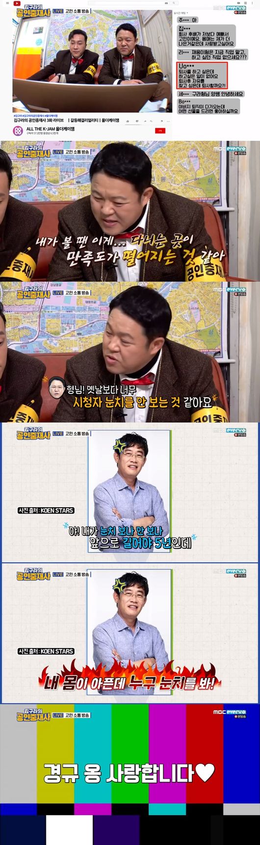 이날 라이브 고민 소통 방송에서는 '자유를 찾고 싶어서 회사를 그만 두고 싶다'라는 고민이 올라왔다. 이에 김구라는 "회사에 대한 만족도가 떨어지는 것 같다"라며 "이경규 형에게 방송할 때 시청자들의 눈치를 너무 안 보시는 것 같다라고 물은 적이 있다"라고 말했다.