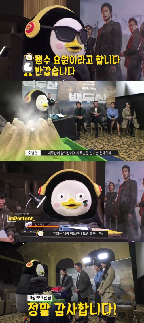 마지막으로 인기 폭발 작전 미션을 수행한 펭수에게 배우들은 '백두산' 요원 키트와 물고기를 선물해 훈훈한 분위기를 더했으며 이에 펭수는 감사의 의미로 남극 참치를 선물하며 마지막까지 유쾌한 웃음을 선사했다.