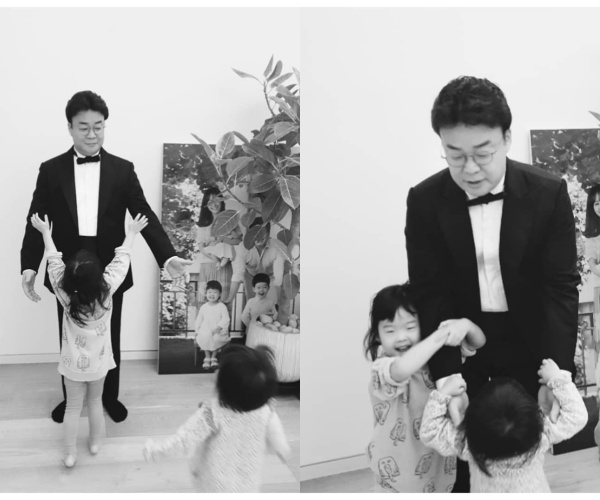 사진 속에서 백종원은 훈훈하게 턱시도를 입고 있는 모습. 세 아이들에게 둘러싸여 제대로된 턱시도 착용샷을 찍지 못했지만 아이들과 함께 행복해 하는 백종원의 미소가 눈길을 끈다.