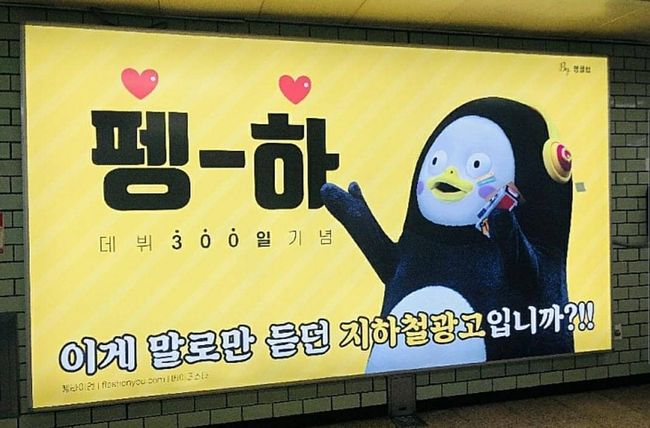 사진 속에는 데뷔 300일을 맞아 한 지하철에 걸려있는 펭수의 지하철 광고로 ‘이게 말로만 듣던 지하철 광고 입니까?!’라는 글이 적혀있다.