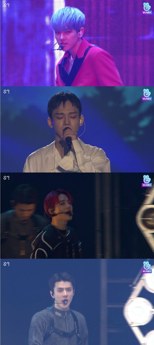 단체 무대 사이에는 멤버 솔로 무대를 배치했다. 가장 먼저 솔로 무대를 꾸민 백현은 ‘유엔 빌리지’로 엑소 단체 무대 때와는 다른 매력을 뽐냈다. 엑소엘과 연인인 듯한 달콤한 분위기가 일품이었다.