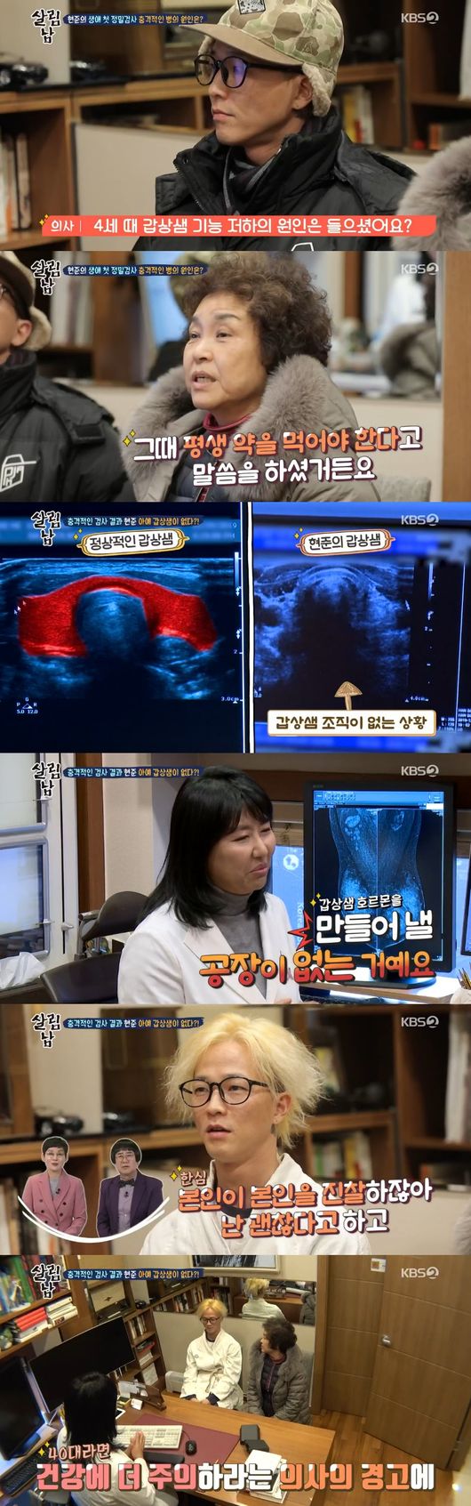 의사는 검사를 바라보더니 "갑상샘 조직이 없다, 기능 저하수준이 아니라 갑상샘 자체가 없는 상태"라며 충격적인 결과를 전했다. 호르몬 만들어낼 공장이 없다는 것. 의사는 "이게 없으면 몸이 피곤도 하지만 몸이 망가진다, 기초대사도 약해지고 집중력 저하된다"며 걱정했다. 그러면서 "40대라면 더 건강에 주의해야해, 평생 약을 드셔야 한다"며 강조했다.