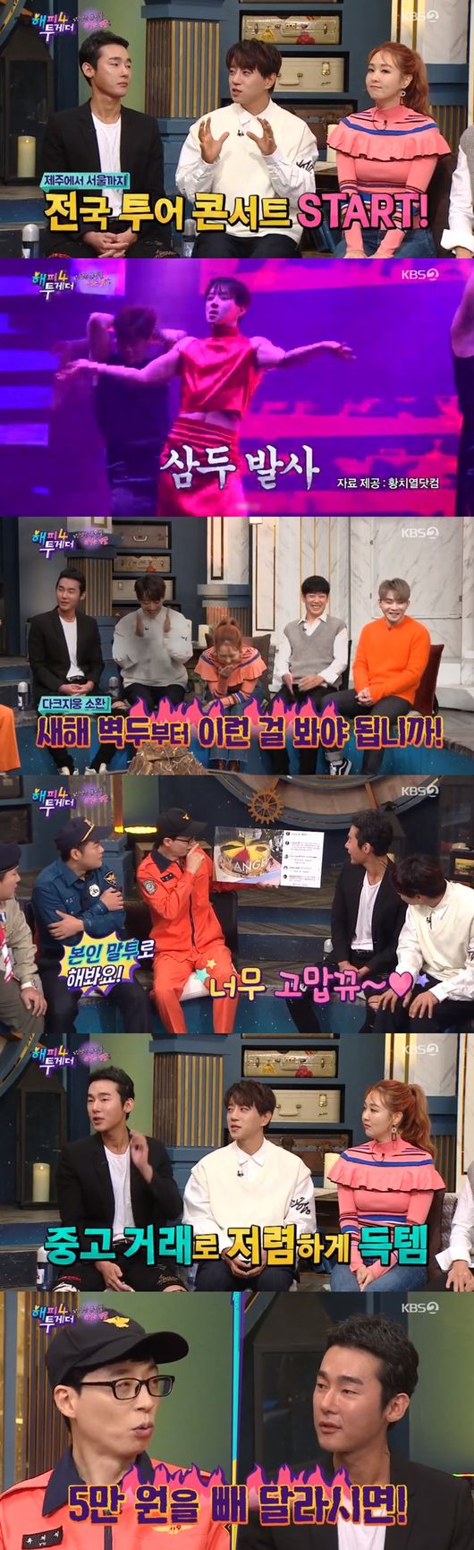 이에 허지웅은 "새해 벽두부터 이런 걸 봐야 하냐"라고 말해 주위를 웃음바다로 만들었다. 황치열은 "나도 여장하는 게 부끄럽다. 근데 하다보니까 점점 뻔뻔해진다"라고 말해 주위를 웃음을 자아냈다.