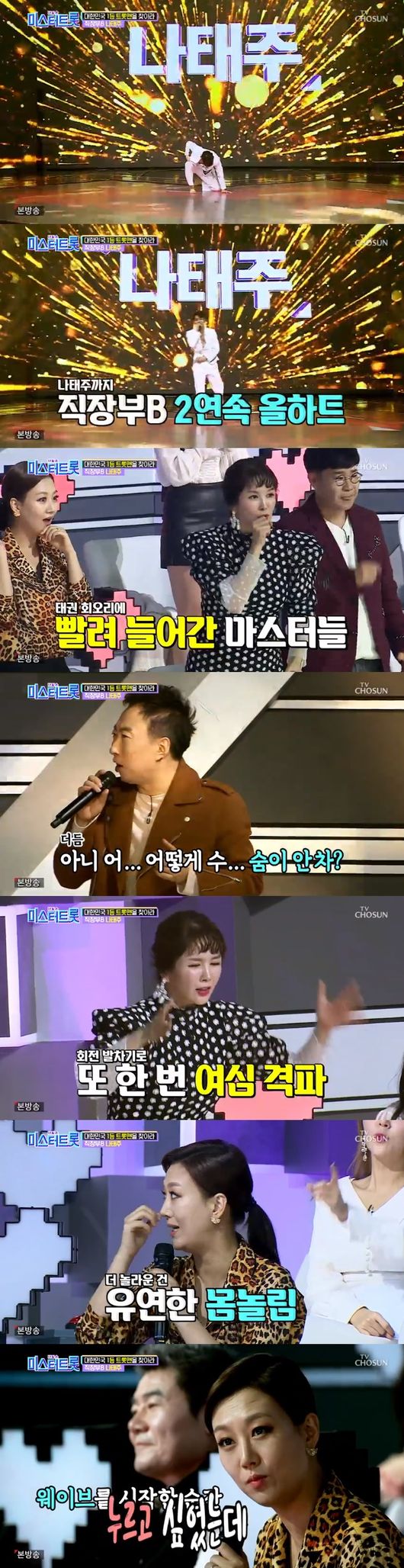 그의 쉴 새 없는 돌려차기와 공중제비에 장영란과 장윤정, 노사연, 신지는 환호했고 이어 올하트를 받으며 직장부 연속 올하트가 등장 했다. 김준수는 "아니 저렇게 부르는데 안흔들린다"면서 신기해 했다. 박명수는 "숨이 안차요? 원래 그래요?"라고 물어봤고 이에 김성주가 "라이브 맞죠?"라고 질문했고 나태주가 "네 맞습니다"라고 했다.