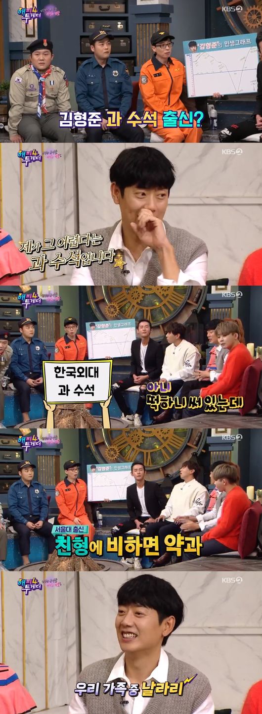 이날 김형준은 자신의 인생 그래프를 공개했다. 인생 그래프 중에선 과수석이라는 단어가 시선을 사로 잡았다. 김형준은 "형이 서울대 나오고 교수를 하고 있다. 나는 가족 중에서 날라리였다"라고 말했다. 이어 김형준은 "과 사무실에서 등록금을 되 찾아 가라고 연락이 왔다. 그 돈을 받고 아버지께 드릴까 하다가 내가 챙겼다. 친구들 밥도 사주고 나이트도 갔다. 3개월 만에 다 썼다"라고 말했다.