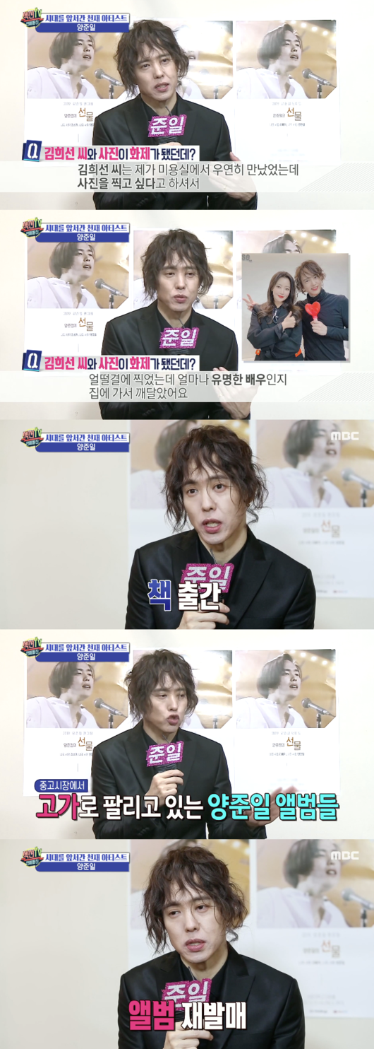 또한 양준일은 배우 김희선과 찍은 사진이 크게 화제가 됐는데 “김희선 씨는 미용실에서 우연히 만났는데 사진을 찍고 싶다고 해서 얼떨결에 찍었는데 얼마나 유명한 배우인지 집에 가서 깨달았다"며 “‘이게 무슨 일이지?’라는 생각이 들었고 요즘 매일 생각하는 게 ‘무슨 일이지?’라는 거다”고 했다.