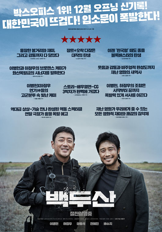 이러한 ‘백두산’의 식지 않는 흥행 열기는 스펙터클한 볼거리부터 대한민국 대표 배우들의 폭발적인 연기 시너지, 따뜻한 감동과 가족애까지 전 세대가 함께 볼 수 있는 가족 영화임을 다시 한번 입증하고 있다.
