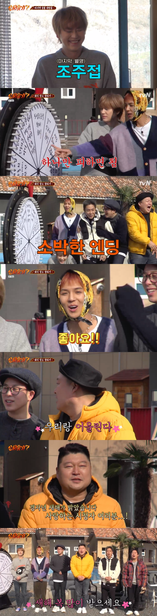긴장감 속에 룰렛을 돌린 결과 동네 호프집이 선택됐다. 멤버들은 "우리랑 잘 어울린다"며 좋아했다. 소박한 회식을 바라던 스태프들 역시 만세를 불렀다. 멤버들은 한데모여 시청자들에게 절을 올리며 새해 인사를 건넸고 시즌8을 약속했다.