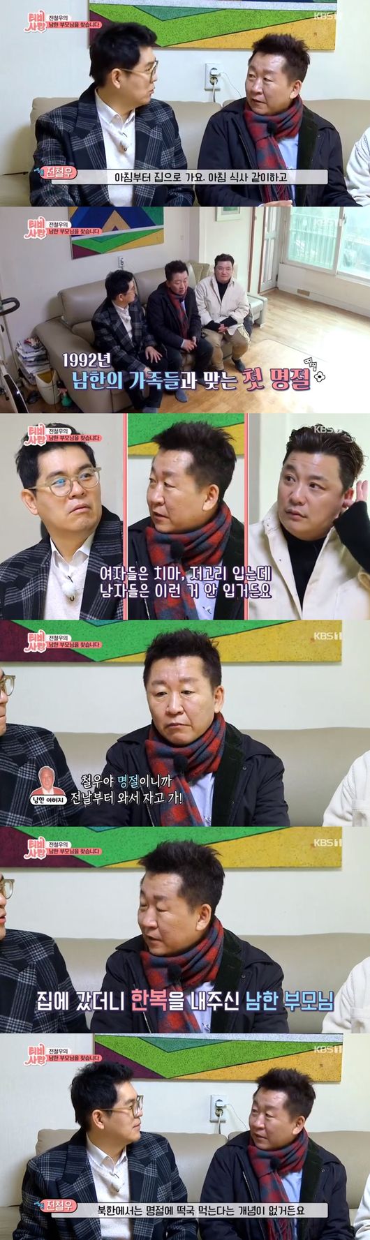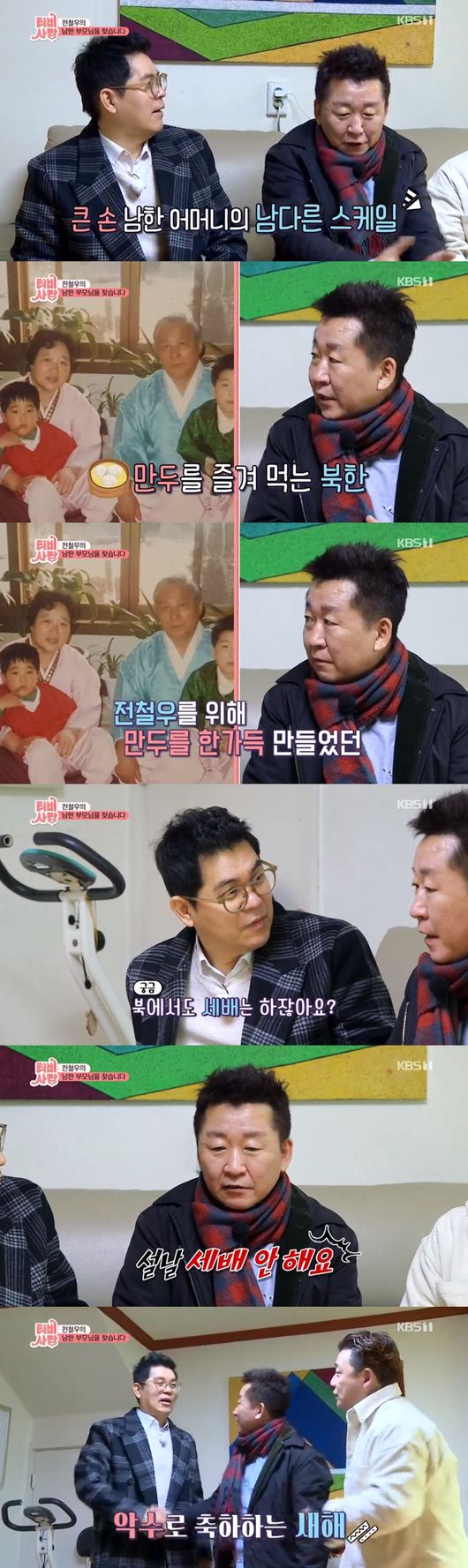 전철우는 "북한은 설날에도 세배를 안 한다. 아침에 떡국도 안 먹는다. 그래서 이상하다라고 생각했다. 북한에선 설날에 악수를 하면서 새해를 축하한다라고 그냥 인사만 한다. 그래서 안기부에 왔을 때 처음으로 절을 배웠다. 남한 부모님께 처음으로 절을 했다. 너무 어색했다"라고 말했다.